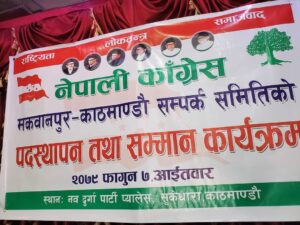 नेपाली काँग्रेस मकवानपुर काठमाडौं सम्पर्क समितीद्वारा नवनिर्वाचित पदाधिकारी तथा सदस्यहरुलाई पदस्थापन गरेको छ। नेपाली काँग्रेस मकवानपुर काठमाडौं सम्पर्क समिती सभापति पुरुशोत्तम ठकुरीको अध्यक्षतामा सम्पन्न पदस्थापना कार्यक्रममा मकवानपुर जिल्ला भित्र र बाहिर रहेर मकवानपुरको समग्र बिकासका लागि योगदान प्रदान गर्नुहुने ब्यक्तित्वहरुलाई सम्मान गरेको छ ।